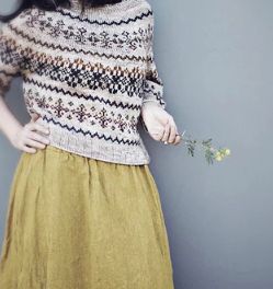 Old World — это объёмный пуловер с глубоким вырезом, бесшовно связанный сверху вниз. Под горловиной добавлены короткие ряды для лучшей посадки. Свитер украшен узором, нанесённым методом плетения.
